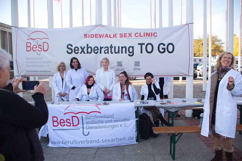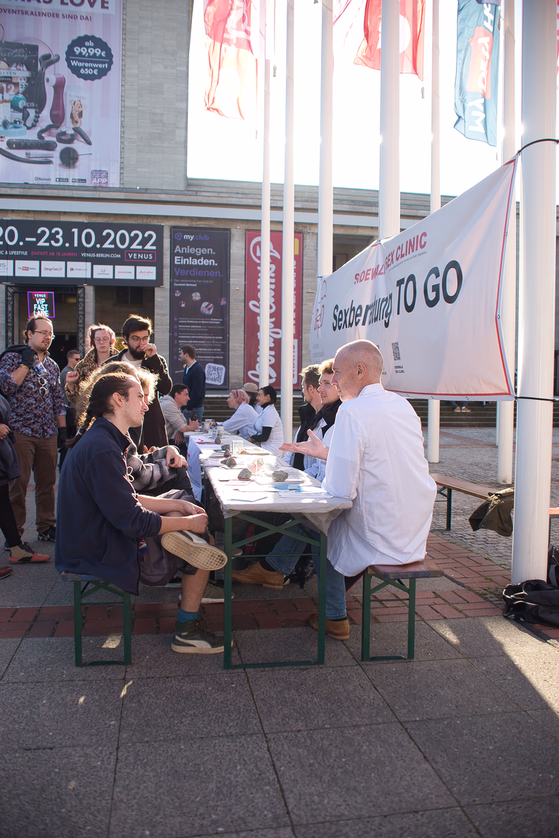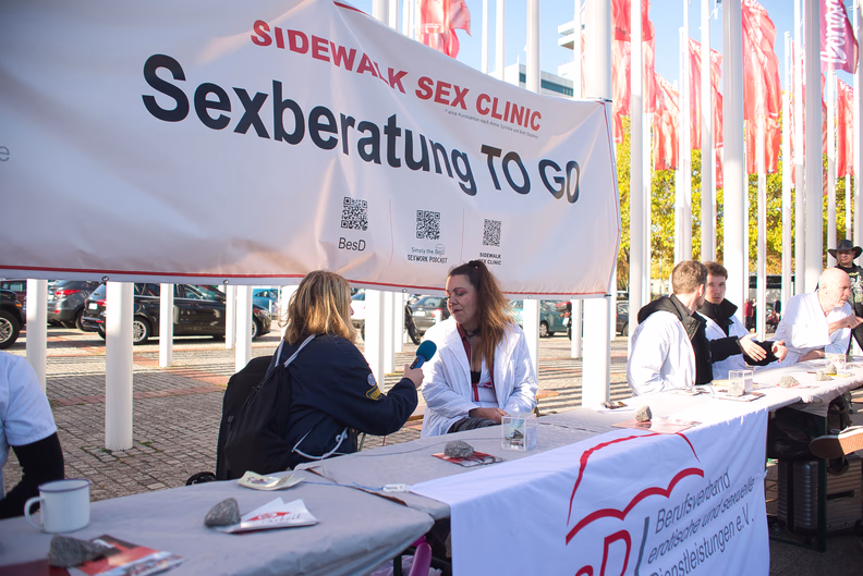 Ein High­light war 2022 die „Free Side Walk Sex Cli­nic – BesD Edi­ti­on“ vor dem Mes­se­por­tal, wo BesD-Mit­glie­der eine von Annie Sprink­le inspi­rier­te Per­for­mance zur öffent­li­chen Auf­klä­rung durch­führ­ten: Sexpert*innen in wei­ßen Kit­teln boten anony­me Bera­tung zu inti­men und emo­tio­na­len Fra­gen, was vom Mes­se-Publi­kum auch freu­dig ange­nom­men wur­de! Die­se „Sex­be­ra­tung to go“ wur­de auch von Ulri­ke Zim­mer­mann im Rah­men ihres „f*ck for future“-Pro­jekts gefilmt.