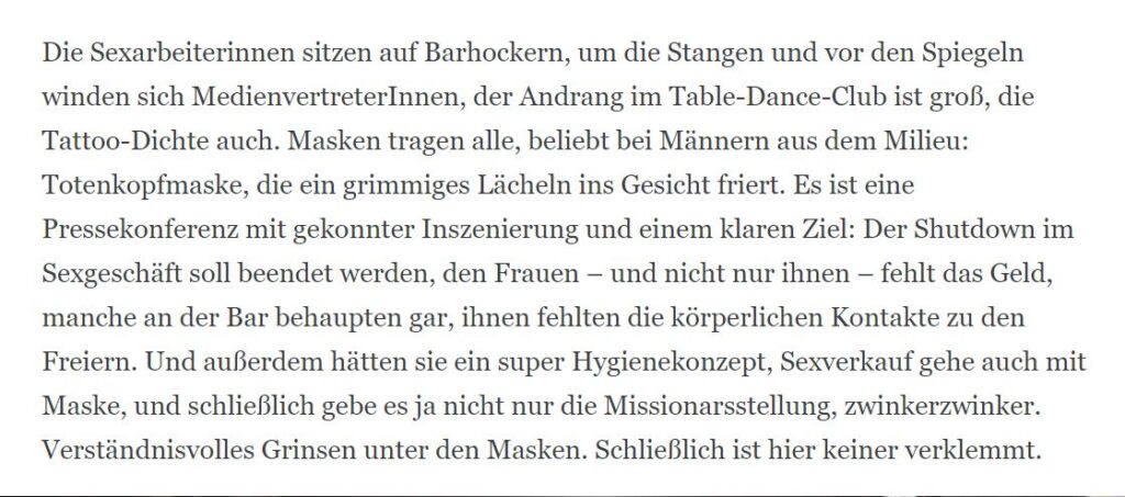 Replik von Miss Daria, Sexarbeiterin und Mit-Organisatorin der Demo in Stuttgart auf die Äußerungen einer bei der Pressekonferenz im Tabledance-Club Messalina anwesenden Journalistin. Wenn sich die Gegnerfraktion einschleicht… ...und ein Paradebeispiel dafür bietet, dass wir Sexarbeiter*innen von eben…