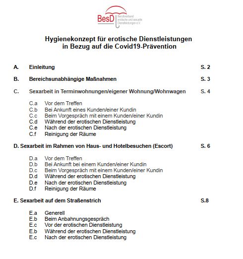 Konkrete Konzeptvorschläge für alle Arten von Prostitutionsstätten sind Aufgabe der zuständigen Betreiberverbänden und ‑zusammenschlüsse. Diese sind aufgrund des Prostituiertenschutzgesetzes (ProstSchG) und ganz unabhängig von Corona bereits zu passgenauen Hygiene-Konzepten und der Hinwirkung auf die Vermeidung von sexuell übertragbaren Krankheiten jeder Art verpflichtet. „Im Gegensatz zu vielen anderen Branchen, die nun erst einen verstärkten Umgang mit Hygiene erlernen müssen, gehören vorbeugende Maßnahmen gegen Übertragung von sexuell übertragbaren Krankheiten zu unserem Arbeitsalltag. Sexarbeitende sind gewohnt und in der Lage, mit dem Thema Infektionsschutz verantwortungsvoll umzugehen.“ (Zitat Undine de Rivière, BesD-Mitglied)Hilfe durch Gleichbehandlung bei Corona-Lockerungen