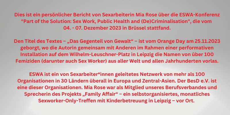 Ruby Rebelde hat in ihrem Vortrag „Intersectional analysis on sexworkphobia in Western Europe“ hervorgehoben, dass viele der gesellschaftlich existierenden Diskriminierungsformen sich mit Sexworkphobie kreuzen. Rassismus (migrantische Biographien), Anti-Romanism/Anti-Sintizzism, (trans-)Misogyny-Sexismus und Ableismus sind nur einige ihrer Beispiele. Es geht also um die gesellschaftliche Mehrfachdiskriminierung von Sexarbeitenden. Um Intersektionalität.„Sexworkphobia ist die strukturelle und systemische Verflechtung von institutioneller, ökonomischer, kultureller und individueller Diskriminierung, der Sexarbeiter*innen ausgesetzt sind, die sich in aktuellen politischen, kulturellen und sozialen Phänomenen wie Othering oder Ausgrenzung widerspiegeln.“ (Ruby Rebelde, ESWA-Conference 12/2023)In der aktuellen Debatte um das „Sexkaufverbot“ werden fast schon klandestin gesamtgesellschaftliche Themen und Strömungen verhandelt, die eben nicht ausschließlich die Sexarbeit betreffen. Und so teile ich Rubys Überzeugung einer notwendigen Vernetzung mit zivilgesellschaftlichen Organisationen als ein Gebot der Stunde. Sexworkphobia spiegelt Phänomene, die Viele angehen. Bündeln wir unsere Kräfte mit ebenfalls Betroffenen. Im persönlichen Gespräch wies Ruby auch auf die Gefährdung unserer Infrastruktur, insbesondere der Fachberatungsstellen, unter einem „Sexkaufverbot“ hin. Eine Befürchtung, die eine Sozialarbeiterin vom Gesundheitsamt Leipzig mir bereits zuvor bestätigt hatte: „Wir sitzen alle im selben Boot“. Daher müsste eine aktivistische Sexarbeit sich auch für den Erhalt unserer Infrastruktur einsetzen. Während des „kleinen Sexkaufverbots“ (Corona-Pandemie) blieb diese glücklicherweise ja noch erhalten.