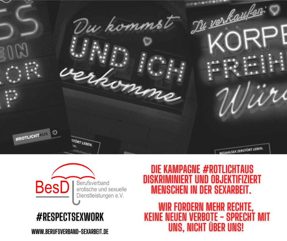 Teilnehmer*innen des Sexwork-Stammtisch Köln, Mitglieder des BesD und weitere Unterstützer*innen wollen am 22. Juni am Roncalliplatz in Köln Gesicht zeigen und uns damit der verunglimpfenden “Rotlicht Aus”-Kampagne von Sisters e.V. entgegen stellen. Wir werden Flyer verteilen und können den Wohnwagen der Straßensexarbeiterin und BesD-Vorständin Nicole Schulze für Plakate nützen. Sexarbeiter*innen und Unterstützende von Sexarbeiter*innen sind herzlich willkommen teilzunehmen und sich zu solidarisieren. Einige von uns werden ebenfalls gerne für Gespräche mit interessierten Bürger*innen und der Presse zur Verfügung stehen! Corona-Regeln werden natürlich eingehalten! Datum: Dienstag, 22. Juni 2021 Uhrzeit: ab 10:00 Uhr bis ca. 20:00 Uhr Ort: Roncalliplatz, 50667 Köln Kontakt für Presse: Nicole Schulze Telefon: +49 157 83518081 Mail: